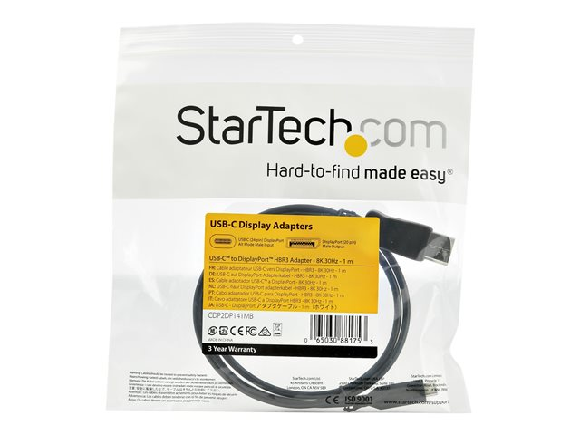 StarTech.com Cable adaptateur USB-C vers DisplayPort de 1 m - 8K a 30 Hz - HBR3 - Compatible Thunderbolt 3 - Adaptateur vidéo externe - USB-C - DisplayPort - noir - pour P/N: TB4CDOCK CDP2DP141MB