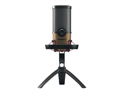 Le CHERRY UM 9.0 PRO RGB séduit par sa conception. Avec son trépied entièrement métallique qui lui assure une bonne stabilité et ses couleurs noir mat et cuivre, ce microphone USB profession-nel attire tous les regards.