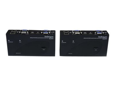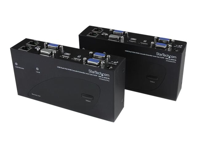 L'extendeur KVM double VGA sur Cat5 prend en charge les boutons poussoirs et les raccourcis clavier d'utilisation facile, qui vous permettent de permuter entre les systèmes connectés localement et à distance, alors que les branchements de console aux deux extrémités de votre configuration offrent un accès facile à tous les systèmes connectés aux deux endroits. Les raccourcis clavier permettent également de régler la vidéo pour optimiser la qualité de l'image sur diverses distances. L'extension sur deux câbles standard Cat5 (ou plus) vous permet d'utiliser le câblage existant afin d'assurer l'accès à distance à votre serveur ou à votre commutateur KVM.