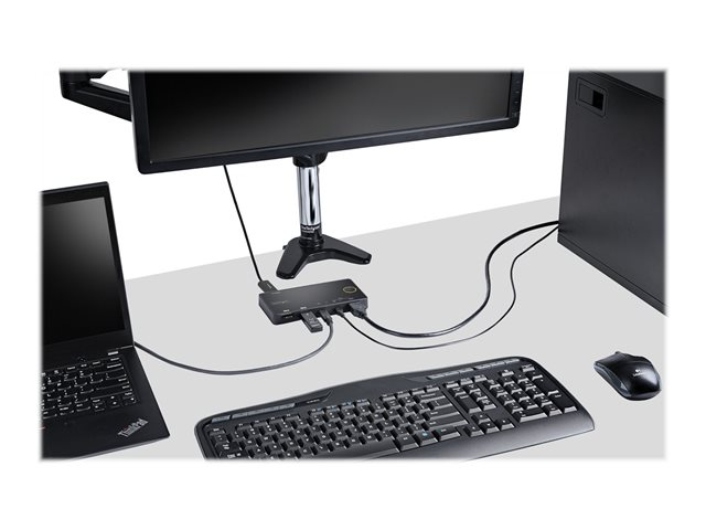 Ce switch KVM USB-C / USB-A à 2 ports vous permet de passer facilement d'un ordinateur de bureau/portable USB Type-C ou Thunderbolt 3 à un ordinateur de bureau/portable USB-A et HDMI, en utilisant un seul clavier, un seul écran HDMI et une seule souris.