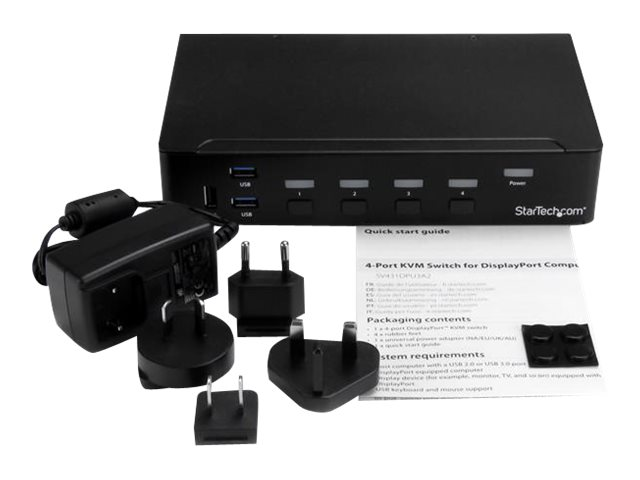 StarTech.com Switch KVM USB DisplayPort à 4 ports - Commutateur écran clavier souris DP avec hub USB 3.0 intégré - 4K 30 Hz (SV431DPU3A2) - Commutateur écran-clavier-souris/USB - 4 x KVM / audio / USB + 3 x SuperSpeed USB - 1 utilisateur local - Montable sur rack - CA 120/230 V / CC 9 - 12 V - pour P/N: SV431RACK